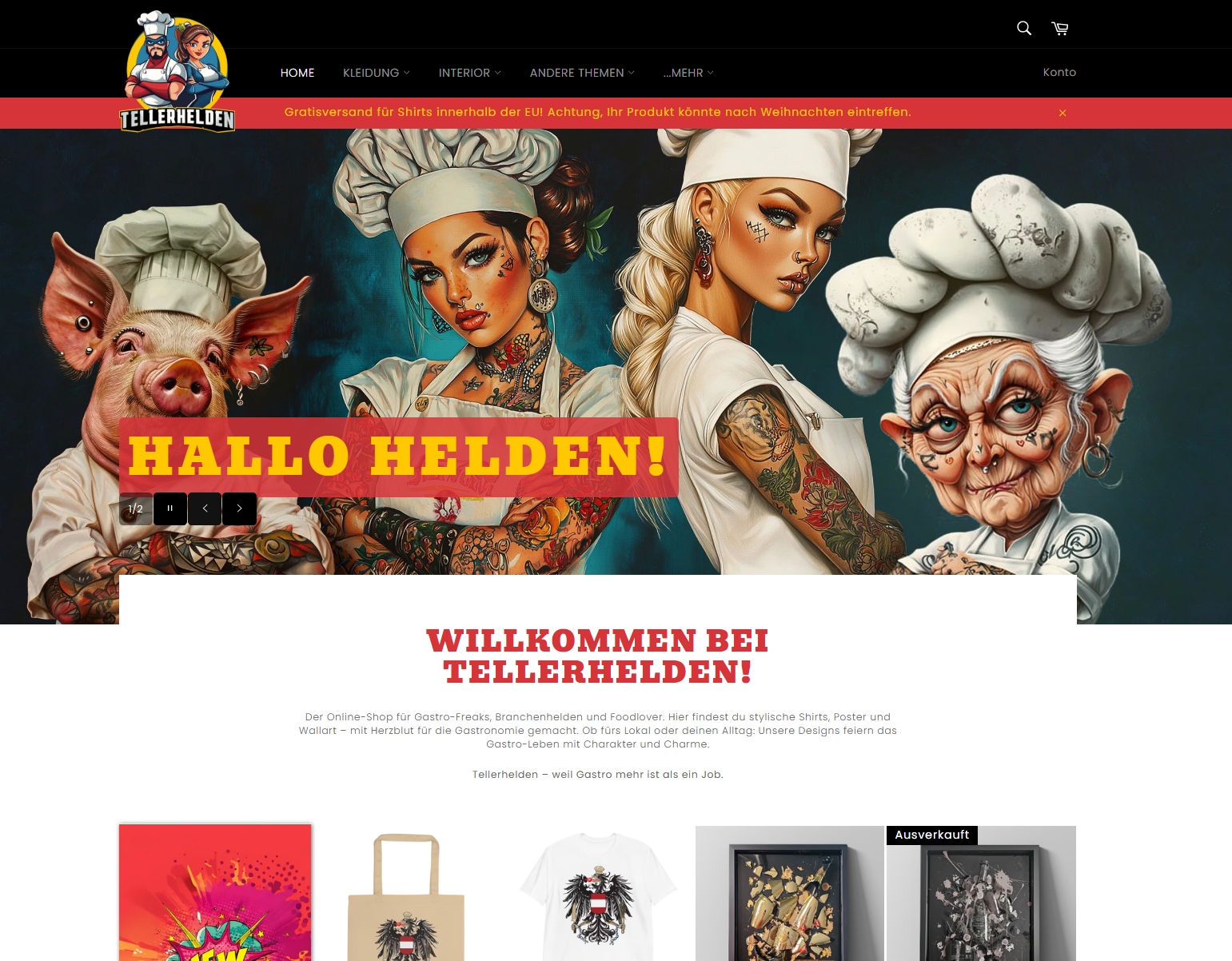 Tellerhelden ist ein Onlineshop mit Herz für die Gastronomie – gemacht für Gastro‑Fans, Branchenhelden und Foodlover. Hier findest du stylishe Shirts, Schürzen und kreative Interior‑Artikel wie Wall‑Art, Broken Bottle Dekorationen und Messerblöcke, die das Gastro‑Leben mit Charakter und Humor feiern. Ob für dein Lokal oder den Alltag: Die Produkte spiegeln Leidenschaft, Tradition und Lebensfreude rund um die Gastronomie wider.