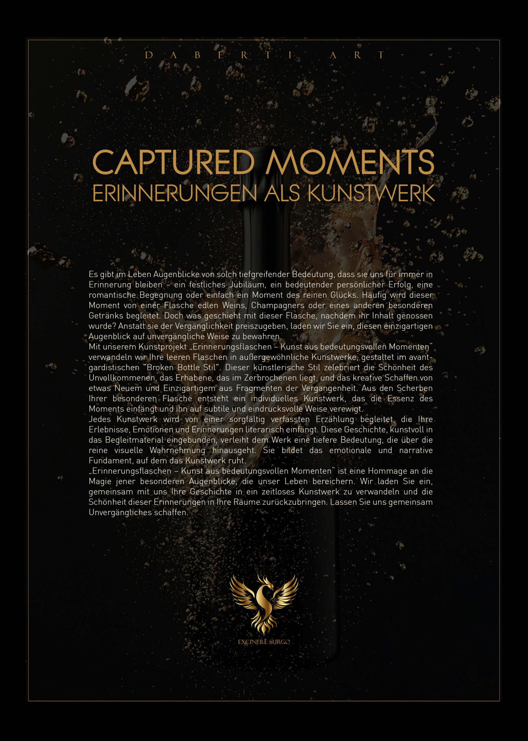 Verwandeln Sie besondere Flaschen aus Ihrem Leben in einzigartige Kunstwerke. Unser Projekt „Captured Moments – Erinnerungen als Kunstwerk“ nutzt den innovativen „Broken Bottle Stil“, um die Essenz Ihrer bedeutendsten Augenblicke einzufangen. Wir gestalten aus den Scherben Ihrer Flasche ein individuelles Kunstwerk und begleiten es mit einer maßgeschneiderten Erzählung, die Ihre persönliche Geschichte reflektiert. Bewahren Sie Ihre Erinnerungen auf eine außergewöhnliche und bleibende Weise – als Kunstwerk, das Emotionen und Geschichte vereint.