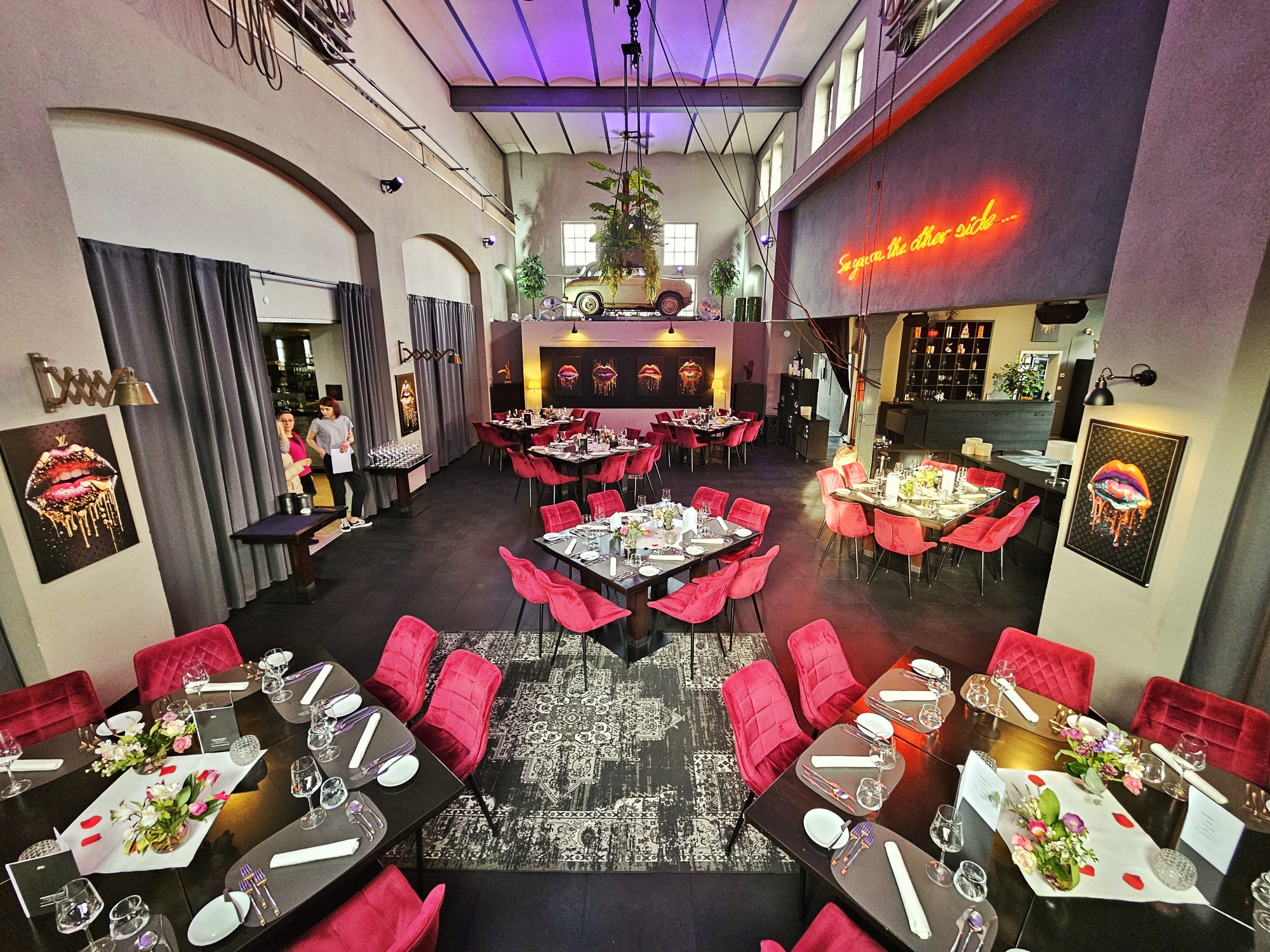 Der Showroom ist unser Haupraum mit historischem Charme: Eine originale Laufkatze ziert die Decke und erzählt von der Geschichte des Hauses. Hier befindet sich auch unser A-la-Carte-Restaurant – ideal für Veranstaltungen, mit offenem Übergang zum Wintergarten und Blick auf die Terrasse. Der Showroom, benannt nach dem früheren Ausstellungsraum einer Oldtimer-Werkstatt, bewahrt noch einige originale Elemente, die den industriellen Charakter spürbar machen.