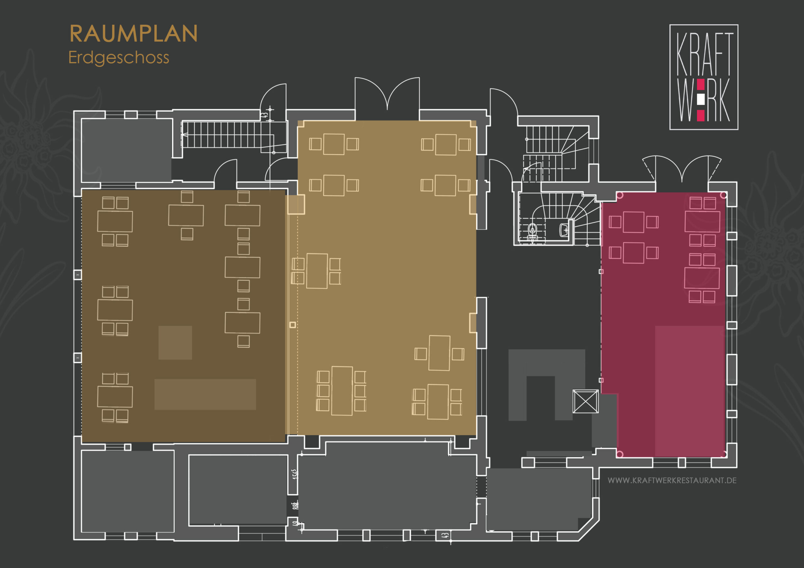 Der Bestuhlungsplan zeigt die gewohnte Anordnung im À-la-carte-Betrieb, wie sie tagtäglich genutzt wird. Insgesamt stehen ca. 50 Sitzplätze im Hauptraum zur Verfügung. Der Raum bietet einen offenen Blick zur Terrasse sowie zur Sissilounge und schafft dadurch eine angenehme, einladende Atmosphäre..